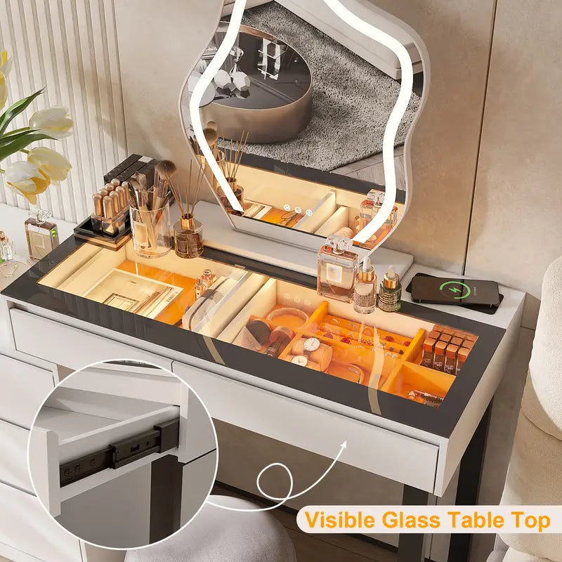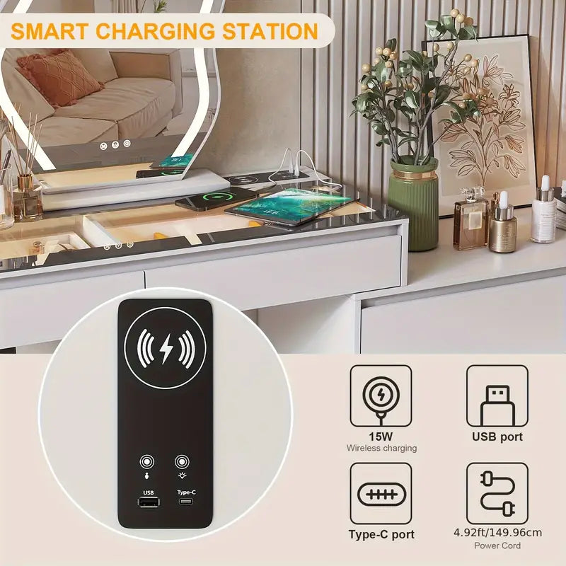 LED Vanity Desk with Mirror – Makeup Dresser with Storage & Charging Station